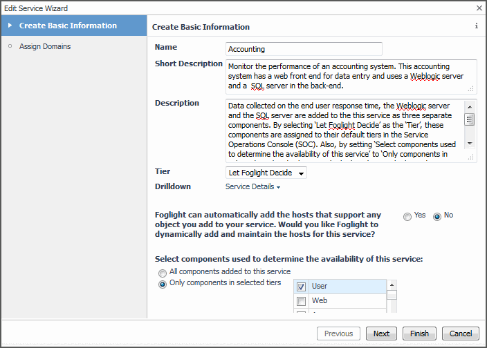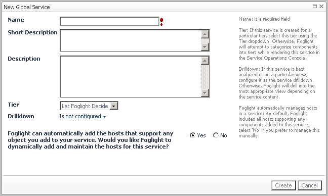 Optional—type a description, select a tier, or configure a drilldown, and if you do not want Quest Foglight to dynamically include the hosts to be added to the service select the No option button.