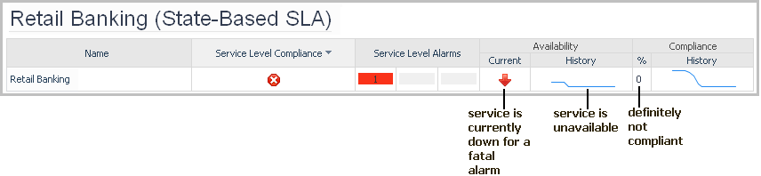 The Service Details page provides details about the service levels that are being monitored by Quest Foglight and measuring the availability of a service. Quest Foglight automatically examines the service and calculates its current availability. Then a percentage availability is calculated and used as the basis for service level evaluation, including alarms.