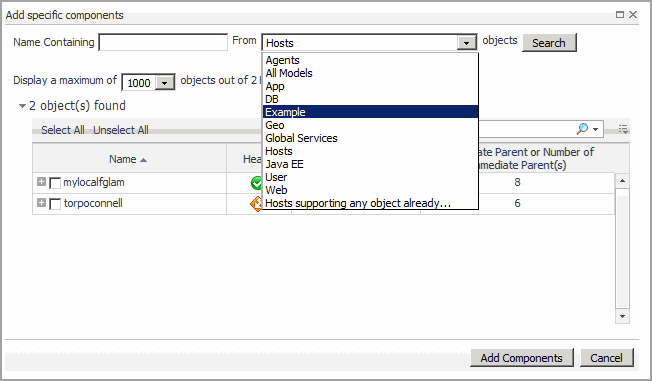In the Object(s) found table at the bottom of the dialog box, select the specific components you want to add to your Object group. Click Select All to quickly select components listed on the table. Click Unselect All to clear the selection. To locate a component by name and type, click Advanced. You can also use regular expressions.