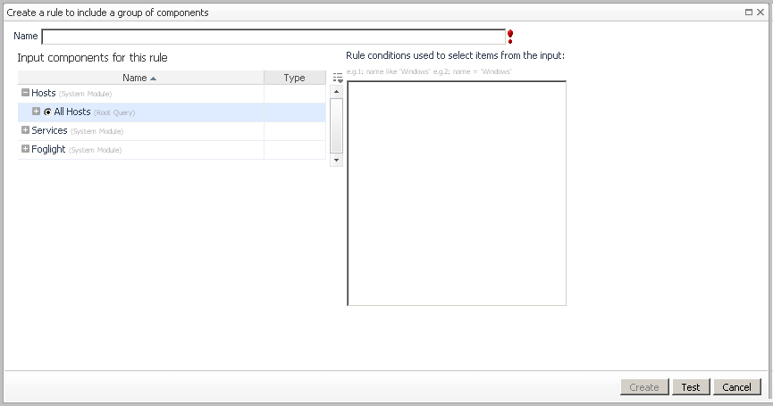 On the dialog box, click Add components to this service and then click Create a rule to add a group of components. Quest Foglight can auotmatically adds the hosts that support any object you add to a service.