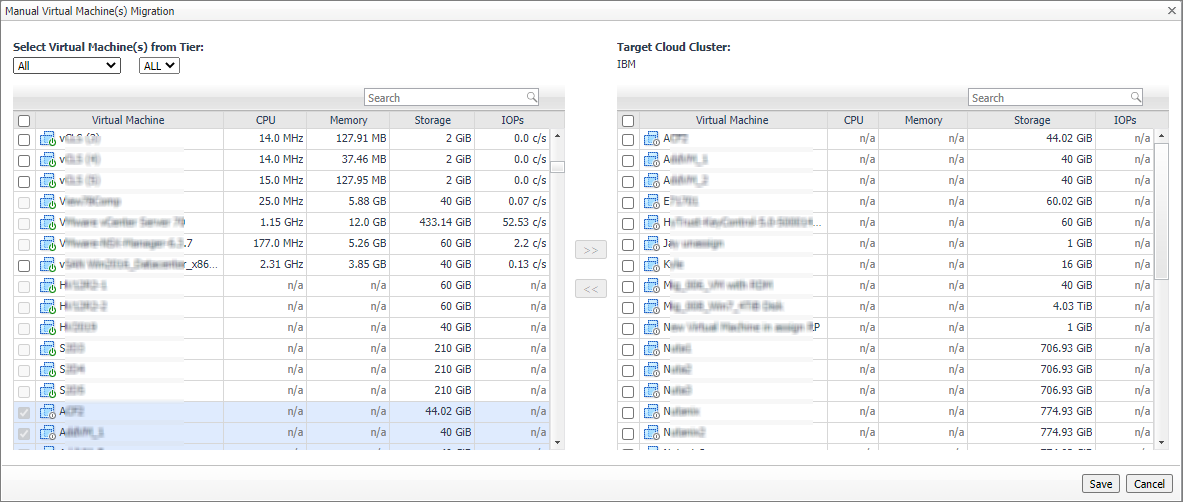 Click Add VMs to open a Manual Virtual Machines Migration dialog box. Select the VMs you want to add to the cloud cluster. The Memory Usage, CPU Demand, Storage Usage, and Storage IOPs for the selected VMs will be aggregated as Cloud Cluster metrics. Click Save.