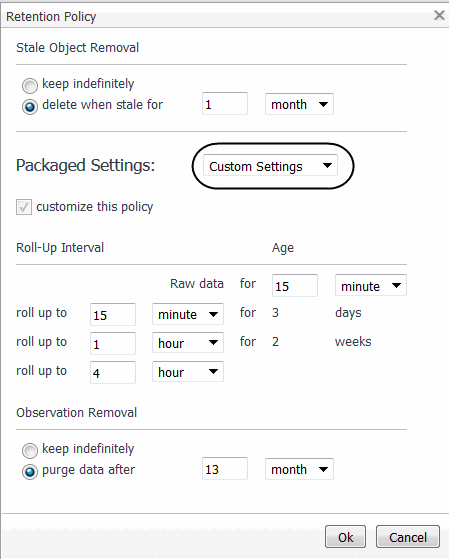 Use the Retention Policy dashboard to set system-wide policies for managing database growth through automatic data aggregation and data purges. You can use standard policies (for example, short-term, long-term, or managed roll-ups) or create a custom retention policy.