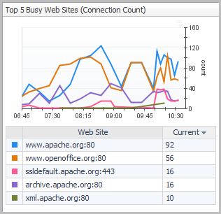 The Top 5 Busy Web Sites chart on the Performance tab allows you to compare the five web sites with the highest connection count.