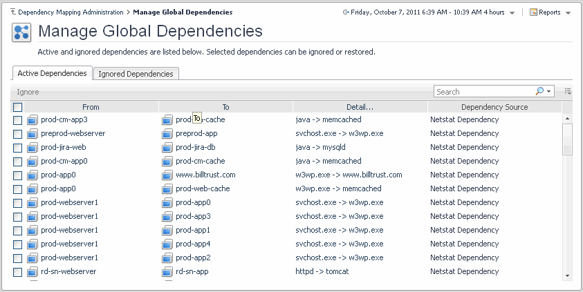 To access this dashboard, click Manage Global Dependencies in the Dependency Mapping Administration dashboard.