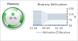 The Memory Load spinner indicates the percentage of the memory resources the selected ESX host currently uses. The Utilization line in the Memory Utilization chart shows the percentage of the memory resources the selected ESX host uses during the selected time period. The Baseline area in the chart indicates the expected memory utilization range based on historical data. | ||