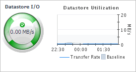 The Datastore I/O spinner indicates the rate at which the selected ESX host currently reads data from and writes to the associated datastore. The Transfer Rate line in the Datastore Utilization chart represents the rate at which the selected virtual center reads data from and writes data to the datastore during the selected time period. The Baseline area in the chart indicates the expected datastore utilization range based on historical data. | ||
