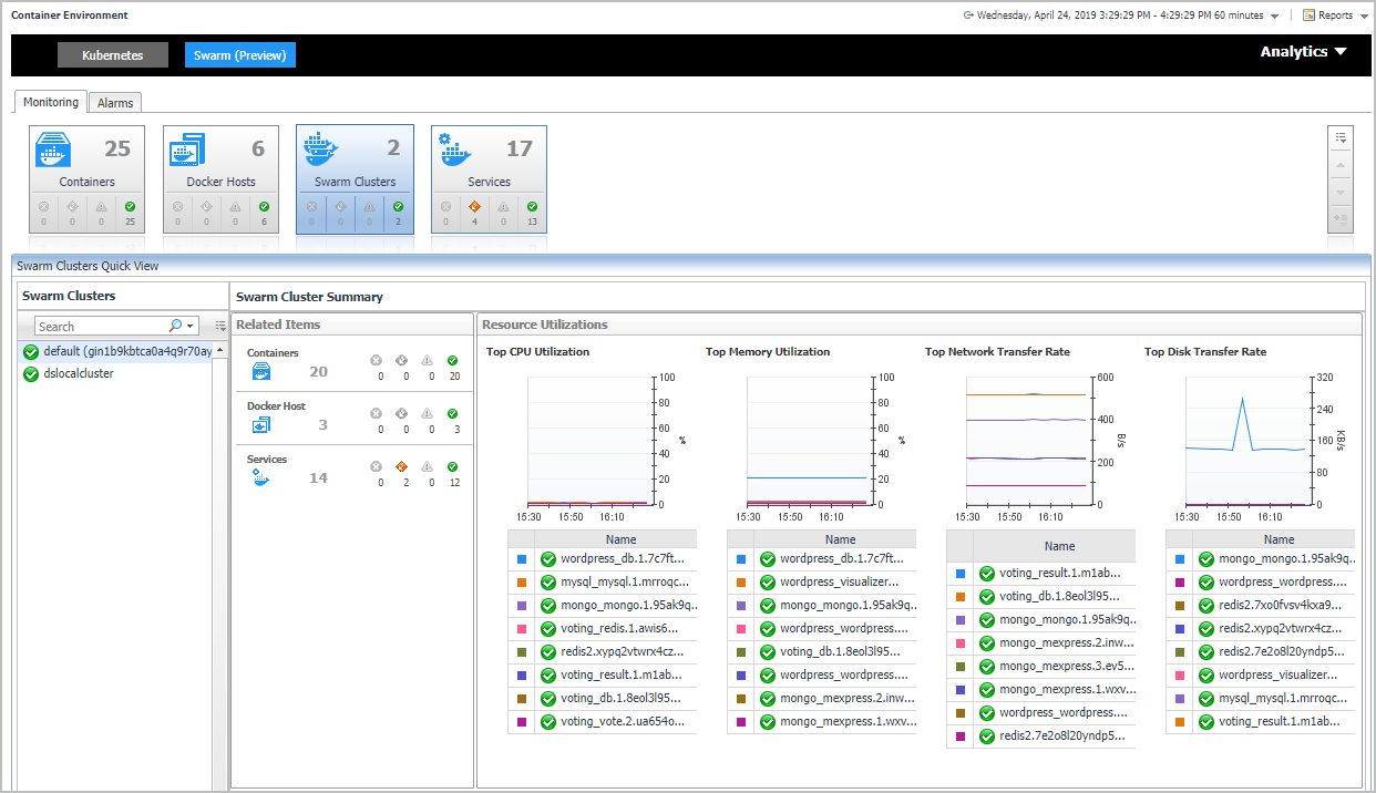 Resource Utilizations: Shows CPU Utilization, Memory Utilization, Network Transfer Rate, Disk Transfer Rate metrics of the containers running in this docker swarm cluster in descending order. |