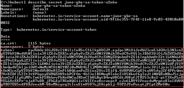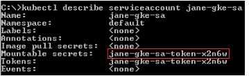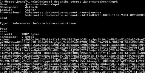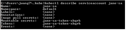 Run the command kubectl describe serviceaccount <service account>. You will get a response similar as below, then record <service account secret> (in this sample, it is jane-sa-token-xkqrk) for later use. |