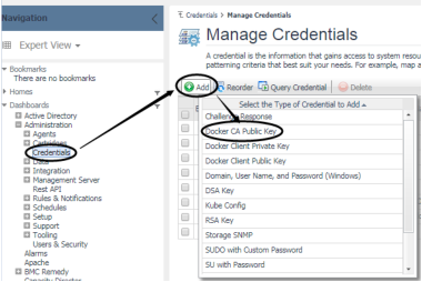 On the Administration > Credentials > Manage Credentials dashboard, click Add, and then select Docker CA Public Key or Docker Client Public Key or Docker Client Private Key to upload related credentials. Take Docker CA Public Key as an example.