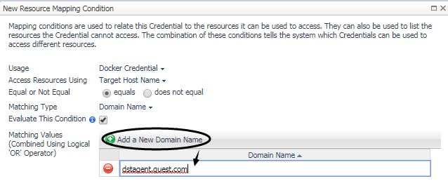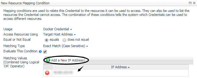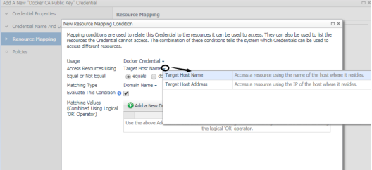 Resource Mapping: Click Add. In the New Resource Mapping Condition dialog box, choose Target Host Name or Target Host Address for the monitored docker host. |