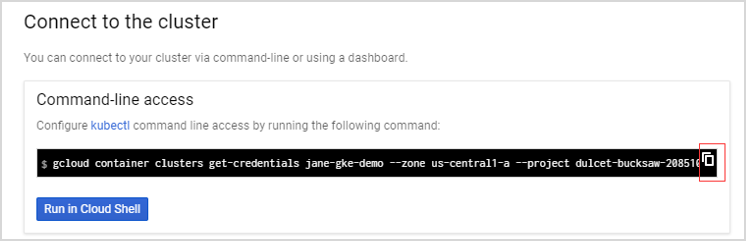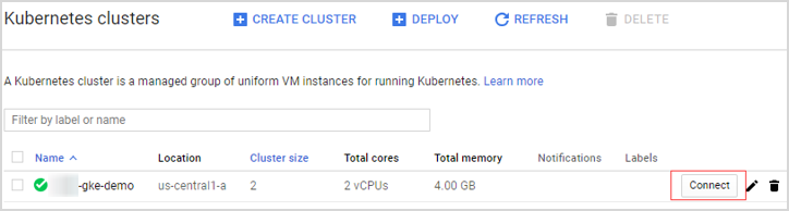 Log into your Kubernetes cluster, click Connect next to your cluster name. |