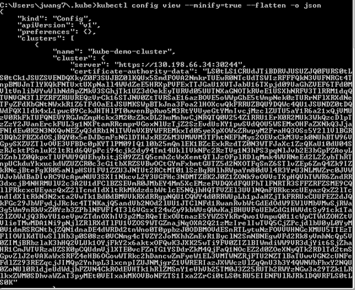 Run the command kubectl config view -minify=true -flatten -o json. You will get an output similar as below, then record the <certificate authority data> for later use. |