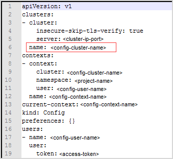 On your local platform, browse to open this configuration file. You may see the context similar to the following. Record <config-cluster-name> for later use. |