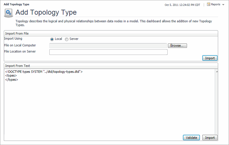 The Add Topology Types dashboard allows you to add new topology types to your topology model and to validate them. To access this dashboard, from the navigation panel, click Dashboards > Administration > Data > Add Topology Type.