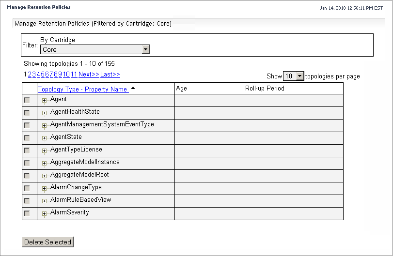 For example, the default retention policy associated with TopologyObject causes the collected data to be rolled up to 15-minute periods after the age of 15 minutes, and stored in Generation 1 for three days. From there, four-hour interval data is rolled up to one-hour periods, and then stored in Generation 2. After 14 days, 5-day interval data from Generation 2 is rolled up to four-hour periods and stored in Generation 3 indefinitely, or until it is purged.