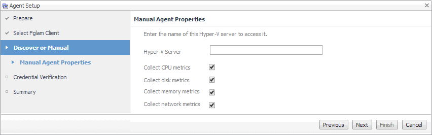 Manually specifying a Hyper-V Server only. On the Manual Agent Properties page that appears, specify the information needed to search for the running Hyper-V servers. |