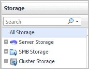 The Storage view is a tree view. It lists the server volumes and cluster volumes existing in your environment, and shows their severity state.