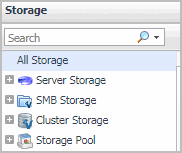 The Storage view is a tree view. It lists the server volumes and cluster volumes existing in your environment, and shows their severity state.