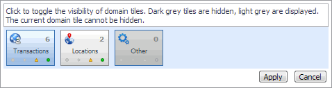 Each tile shows how many of the corresponding object instances there are in your monitored infrastructure, as well as the count of objects of that type in each of the alarm states Normal