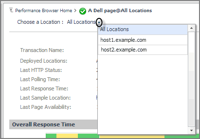 The All Locations drilldown view, displayed by default, allows you to review a larger set of metrics about the selected transaction, and to see how well that transaction is performing when monitored from different locations. Comparing the performance metrics collected from different locations can give you a general view of the responsiveness of your Web sites, and to indicate potential problems at locations that show response issues, and as such might require further investigation. For complete information about the data appearing on this view, see Transaction at All Locations drilldown view.