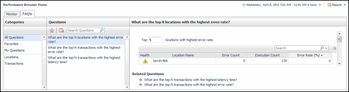 When you navigate to the Performance Browser for the first time, the Monitor tab, described in this topic, appears open. This tab provides an overall summary of your monitored environment. The FAQts tab is also available. For more information about this tab, see Exploring the FAQts tab.