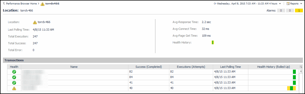 The top part of this view show a number of metrics resulted from monitoring that transaction from the selected location. The bottom part of this view shows a graph indicating the total transaction response times over the selected time range. High peaks in the graph often suggest potential bottlenecks and likely need to be investigated. For complete information about the data appearing on this view, see Transaction at a Selected Location drilldown view.