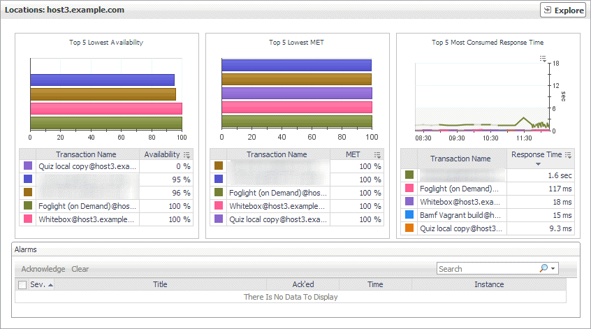 The Location view displays overall response and availability information for the transactions monitored from the selected location. It also identifies the transactions with the lowest availability, lowest MET (met expected time), and highest response time, showing the top five transactions in each of these categories. Use this view to identify the Web sites with degraded performance, and to perform further investigation.