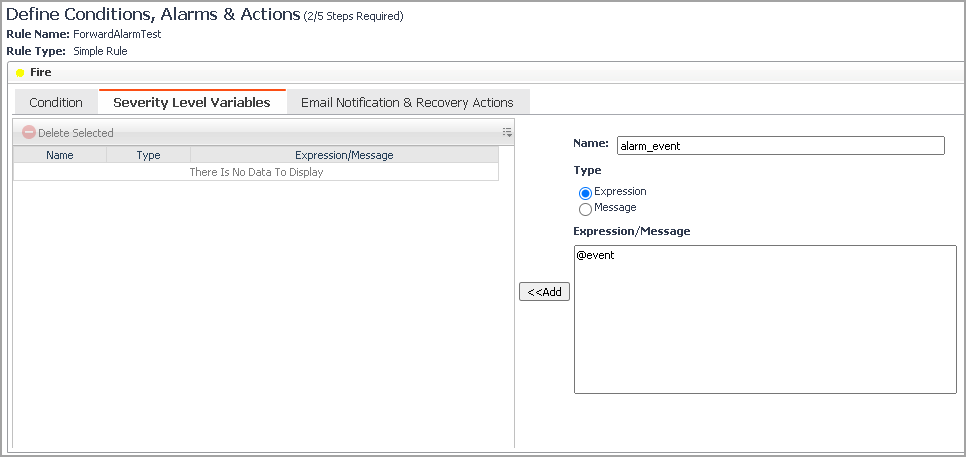 In the Type field, click to select the Expression radio box to add the alarm_event variable.