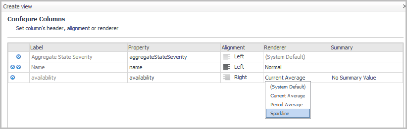 On the Configure Columns page, click in the Renderer box for the availability property and select Sparkline from the list.