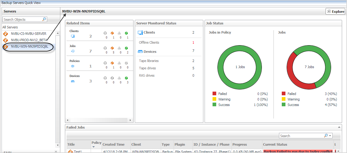Failed Jobs: Displays the detailed information about all failed jobs happened in this NetVault Backup Server.