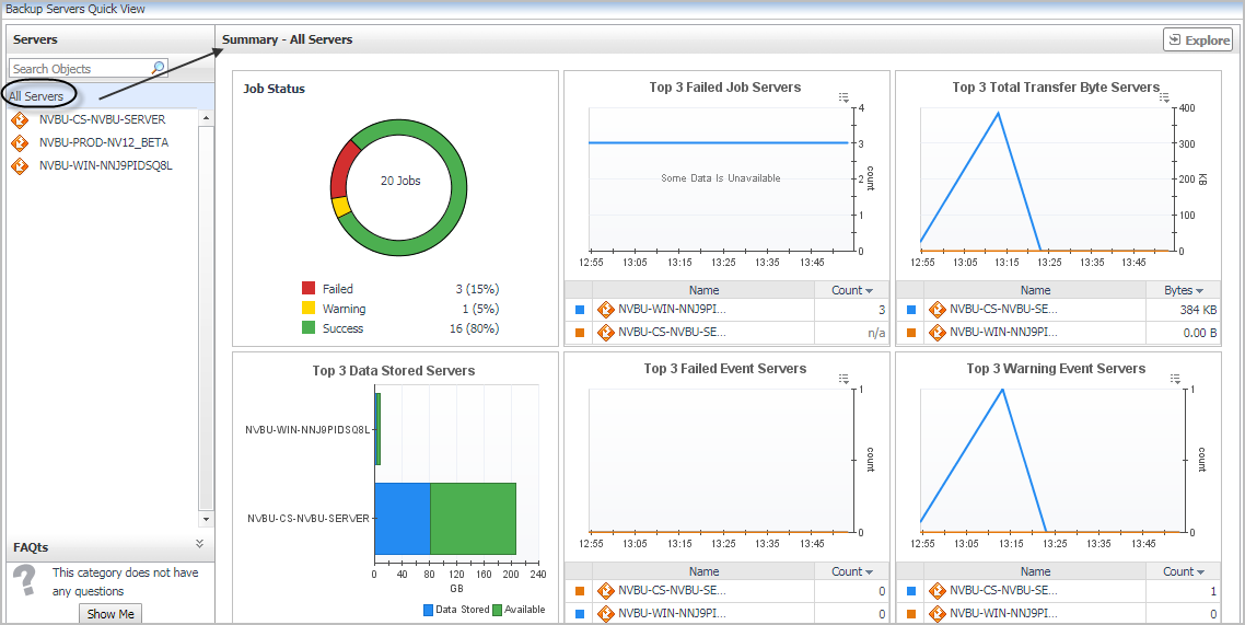Job Status: Displays the number and status (Failed, Warning, or Success) of Jobs existing in all NetVault Backup Servers available in the monitored environment.