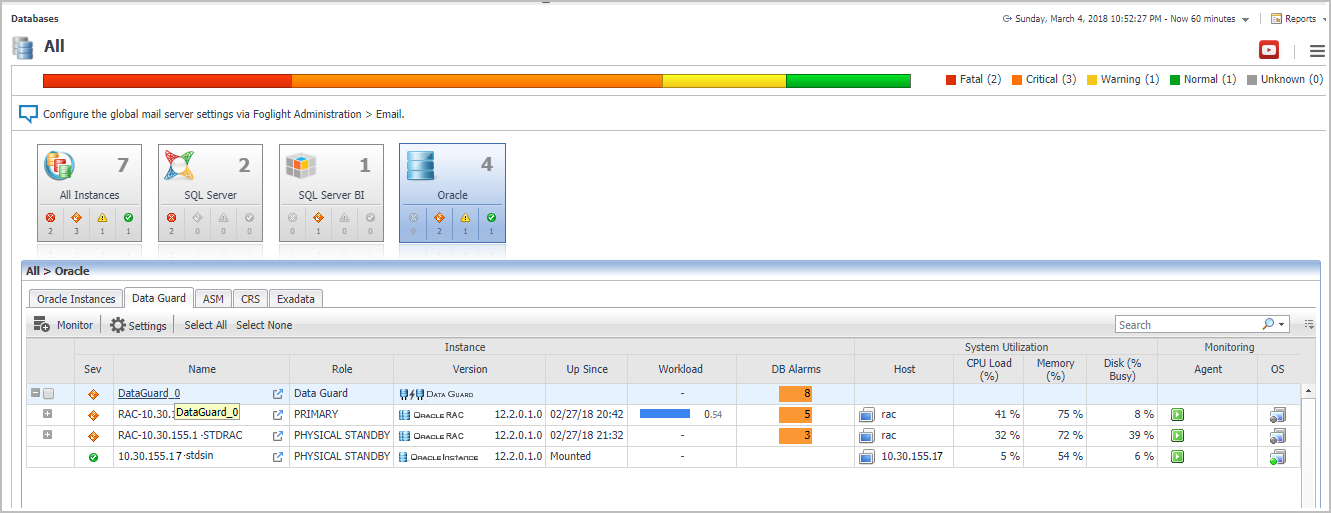 Viewing the Databases Dashboard Assigning Instances to Users Selecting an Instance to Monitor Foglight for Oracle Overview Dashboard Overview view Advisories view SQL Performance Investigator (SQL PI) Oracle Activity Drilldown Pluggable Databases Drilldown Storage Drilldown Reviewing Configuration Settings Reviewing the Alert Log Reviewing Monitored Data Guard Environments Reviewing ASM Instances Reviewing Exadata-related Information