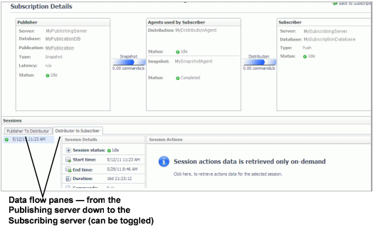 Publisher to Distributor — displays the session actions of the Snapshot or Log Reader agent.