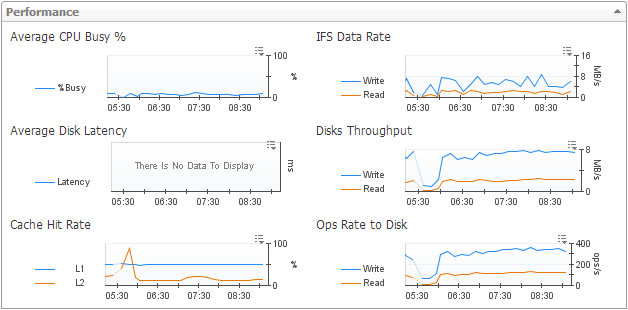 Performance. Charts plot the following metrics for the selected pool over the time period: % Busy, Latency, L1 Cache Hit Rate, L2 Cache Hit Rate, Data Read Rate, Data Write Rate, Read Ops Rate, and Write Ops Rate.