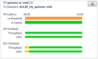 A virtual machine may be connected to multiple datastores and RDM disk extents, each of which may report varying degrees of problems. When a virtual machine has more than one datastore/RDM view, start by scanning the timeline bars in the VM I/O to Datastore/RDM panel to identify a datastore/RDM with consistently slow I/O performance or significant changes from typical performance.