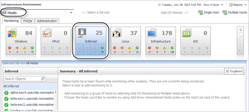 You can see a list of inferred hosts on the Infrastructure dashboard. From this dashboard, you can explore hosts and change their host port assignments if necessary. If you are interested in monitoring and collecting detailed data about an inferred host, you can set up an agent to monitor the host. This action moves the host from the inferred list to the appropriate monitored host list.
