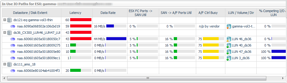 % Competing I/O at LUN. Displays the percentage of I/O being experienced by this LUN for all VMs accessing the Datastore, not just those in this ESX. Click the cell to display the top five VMs doing I/O to this LUN. |