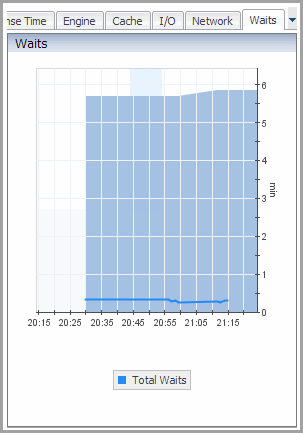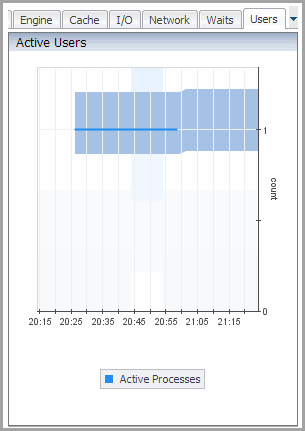 • Total Waits plot line. Click a data point on the plot line to filter the Top Hash, Top SQL, or Top Procedures table according to a defined and corresponding time range. For more information, see Zooming In on a Data Point Using the Filter Pane.Sybase_MDA Agent Active Users Graph View
