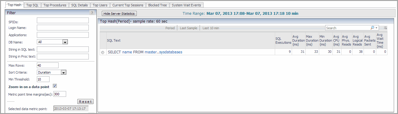 • Hits/s plot line. Click a data point on the plot line to filter the Top Hash, Top SQL, or Top Procedures table according to a defined and corresponding time range. For more information, see Zooming In on a Data Point Using the Filter Pane.