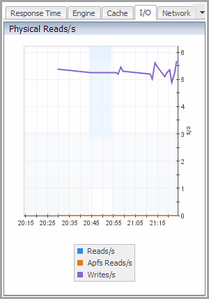 • Apfs Reads/s plot line. Click a data point on the plot line to filter the Top Hash, Top SQL, or Top Procedures table according to a defined and corresponding time range. For more information, see Zooming In on a Data Point Using the Filter Pane.