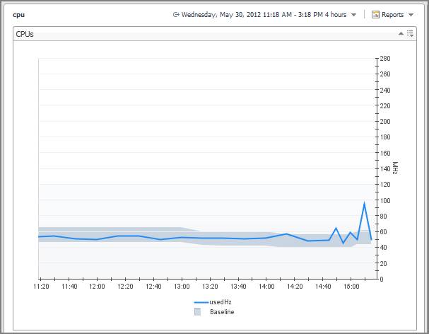 If you open the VMs tab for that same resource pool, the Utilizations view displays one graph illustrating the percent-used and percent-ready CPU utilization for the virtual machines of the resource pool.