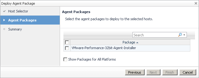 In the Deploy Agent Package wizard, on the Agent Packages page, select VMware-Performance-64bit-Agent-Installer, and click Next.