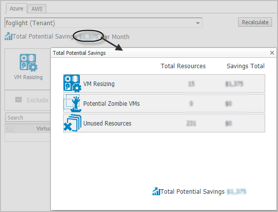 Total Potential Savings. Shows the potential savings per month. Click the savings and a Total Potential Savings dialog box opens. It displays the total resources and total savings for VM resizing, potential zombie VMs, and unused resources. |