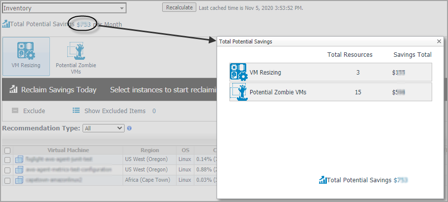 Total Potential Savings. Shows the potential savings per month. Click the savings and a Total Potential Savings dialog box opens. It displays the total resources and total savings for VM Resizing and Potential Zombie VMs. |