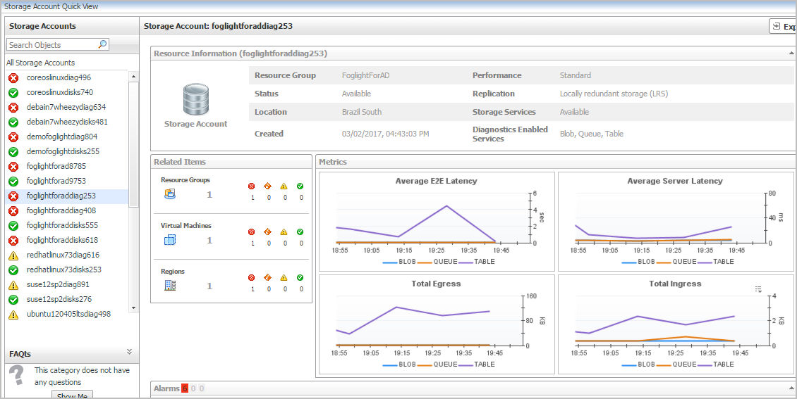 Resource Groups. The number of the resource groups that are associated with the selected storage account, followed by related alarm counts, broken down by the alarm state (Normal, Warning, Critical, Fatal).