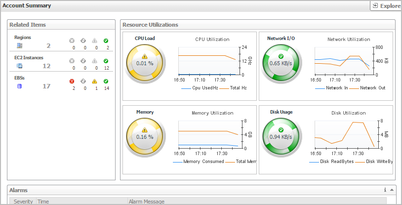 EC2 Instances. The number of the ECS2 instances that are associated with the selected account, followed by related alarm counts, broken down by the alarm state (Normal, Warning, Critical, Fatal).