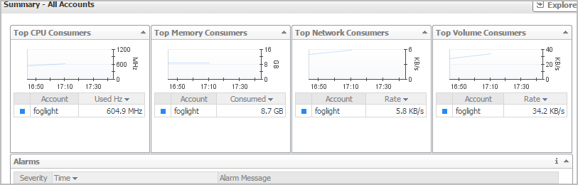 The Summary - All Accounts view displays overall resource utilization information for a group of accounts and shows the elements that consume the highest amount of system resources. This view appears on the right when you select All Accounts in the Accounts view.