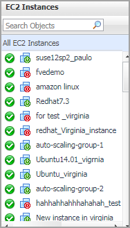 The EC2 Instances tree view lists the EC2 instances existing in your AWS environment and shows their state. This view appears on the left when you select the EC2 Instances tile in the Actions bar.