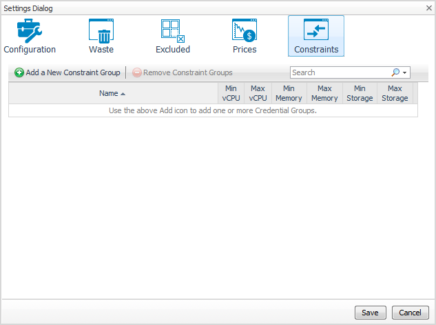 The Constraints tab allows you to set custom thresholds for select objects in the environment. These recommendations are displayed in the Optimizer tab > VM Configuration/ CPU/ Memory/ Storage views > Modify Recommendation column. Use this tab to add, edit, and remove constraints groups.