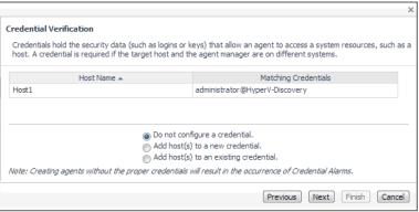 On the Credential Verification page that appears, review the existing set of credentials. If the wizard determines that the selected Agent Manager has any credentials configured for the host on which the Hyper-V Server is running, they appear listed on this page. |